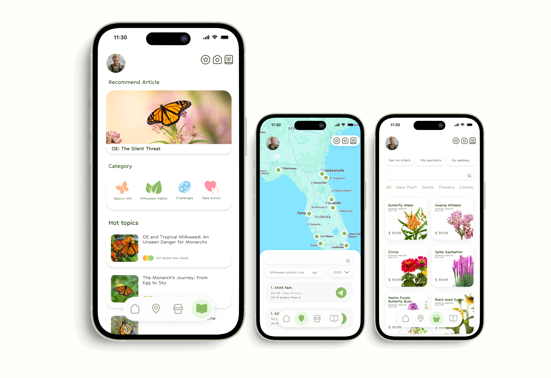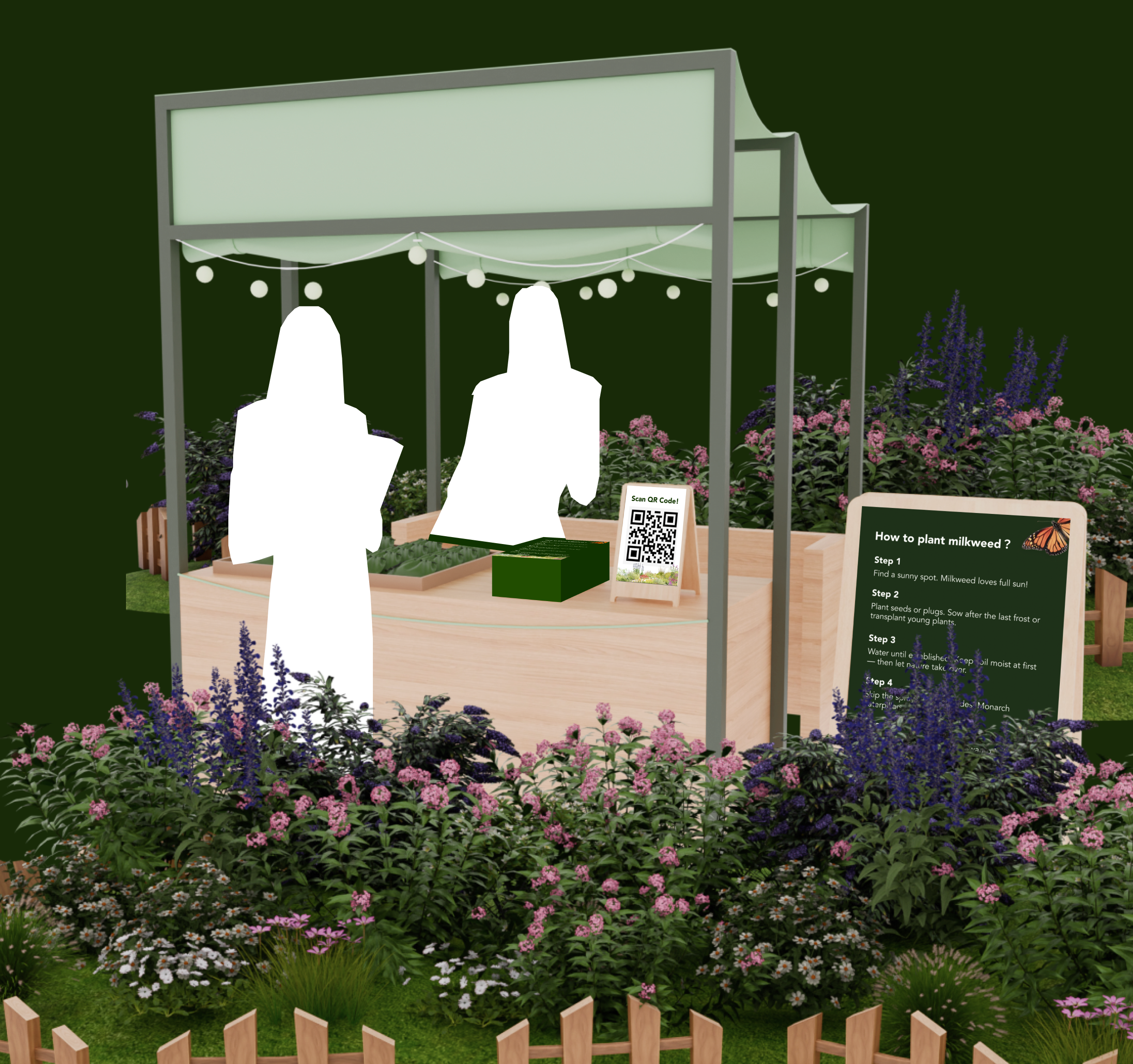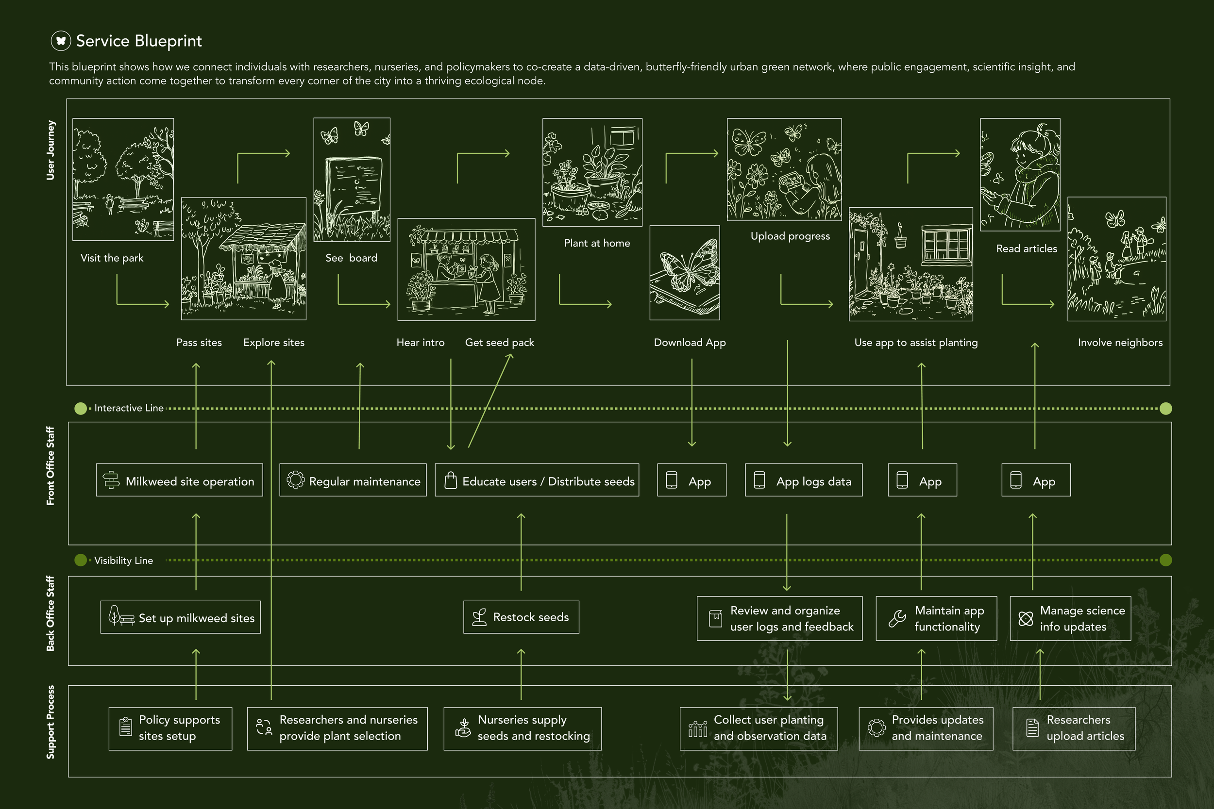 Across urban areas in Florida, the widespread planting of tropical milkweed has unintentionally disrupted monarch butterfly migration and increased the spread of OE parasites. In response, I designed a service system that establishes a network of native milkweed garden sites throughout the city. These sites function as ecological and educational hubs, using clear signage and QR codes to guide informed action and connect visitors to a mobile app. By linking people, places, and knowledge, the project transforms fragmented awareness into a sustained conservation effort.