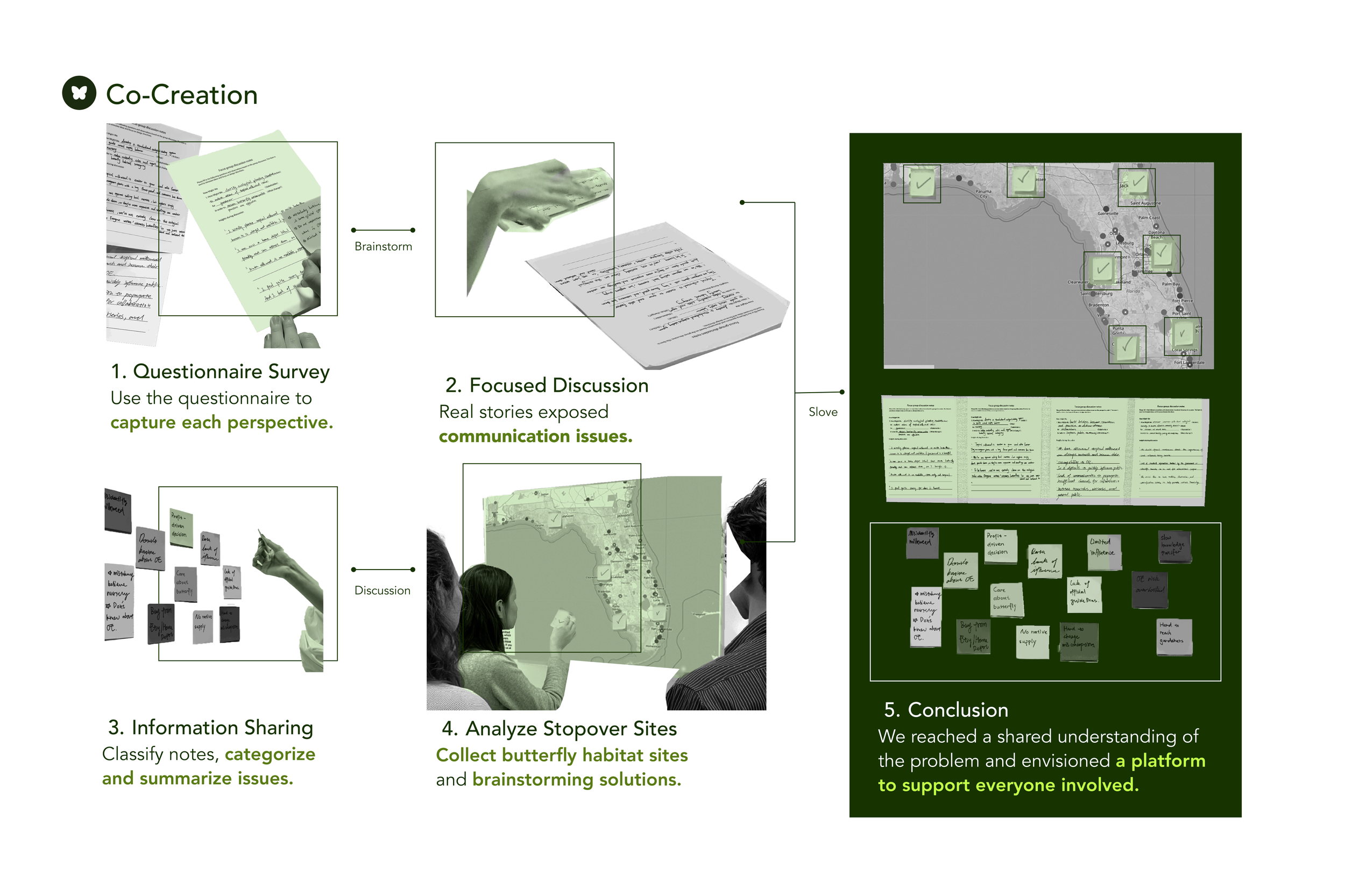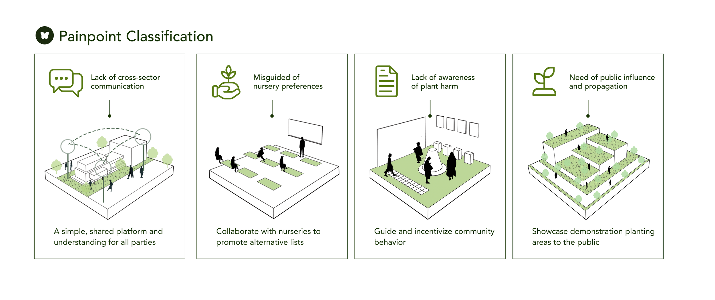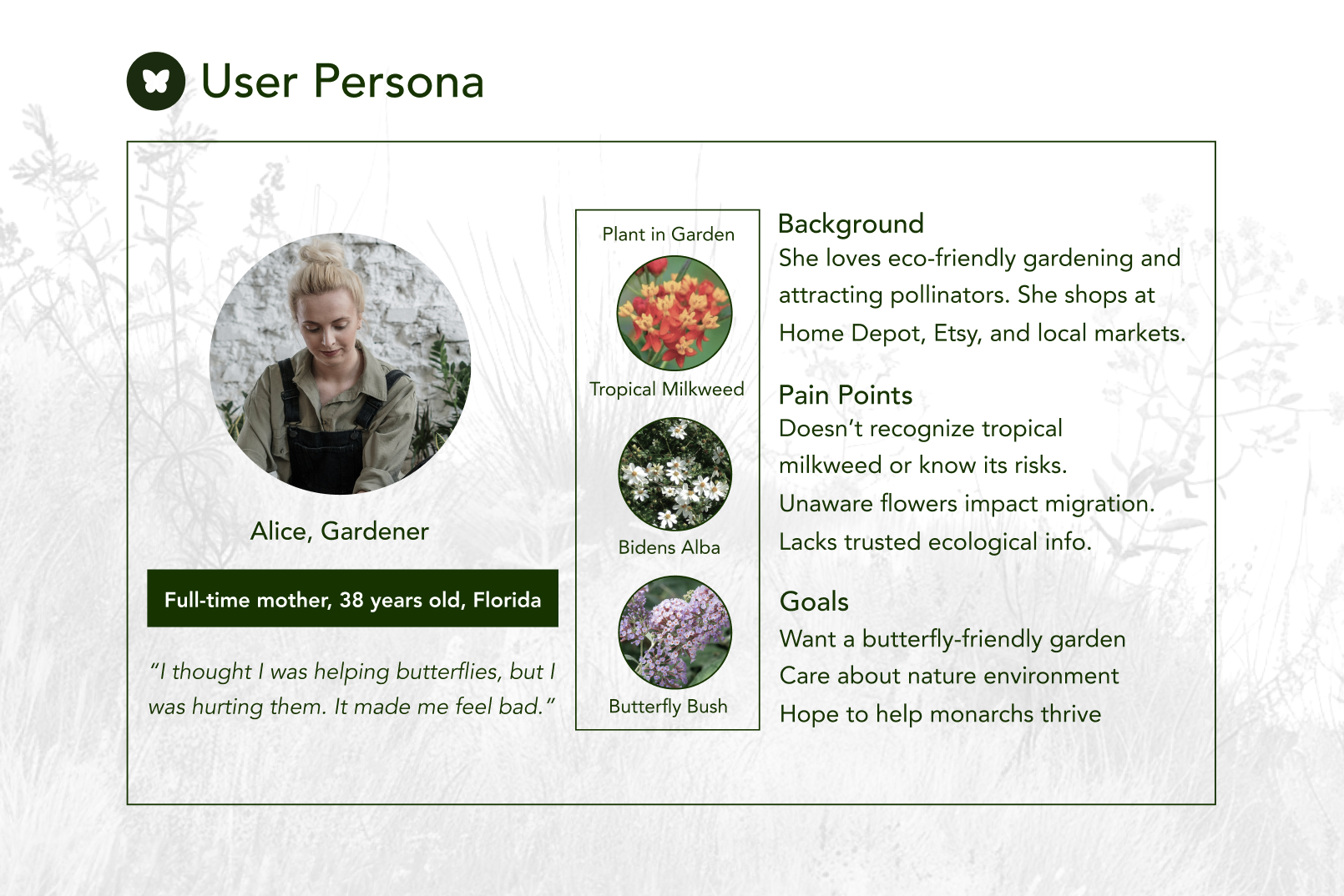 Across urban areas in Florida, the widespread planting of tropical milkweed has unintentionally disrupted monarch butterfly migration and increased the spread of OE parasites. In response, I designed a service system that establishes a network of native milkweed garden sites throughout the city. These sites function as ecological and educational hubs, using clear signage and QR codes to guide informed action and connect visitors to a mobile app. By linking people, places, and knowledge, the project transforms fragmented awareness into a sustained conservation effort.