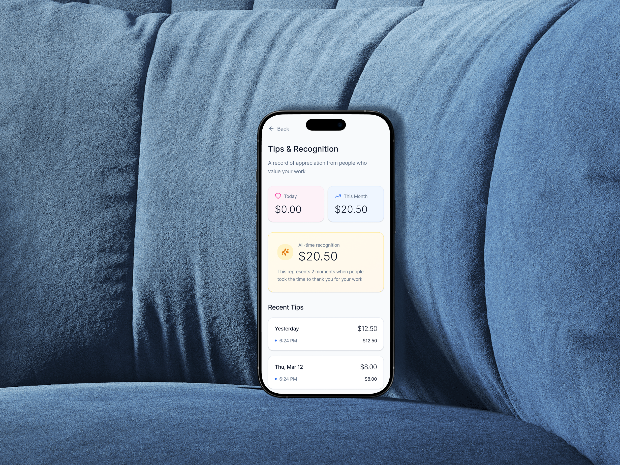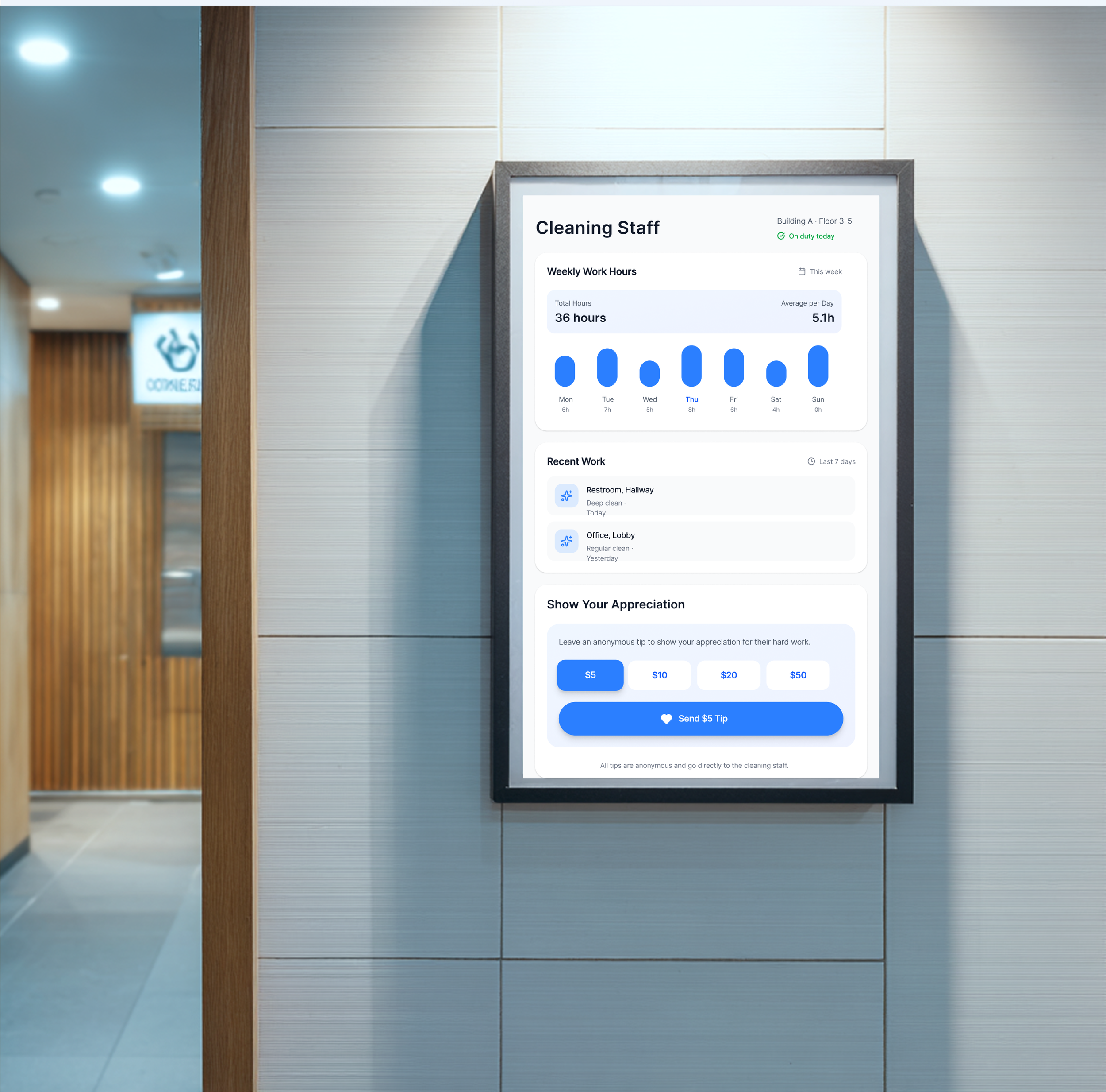 Work becomes visible in the spaces it supports. Through shared displays in offices and restrooms, people can acknowledge the labor behind the environment and offer small, direct tips.