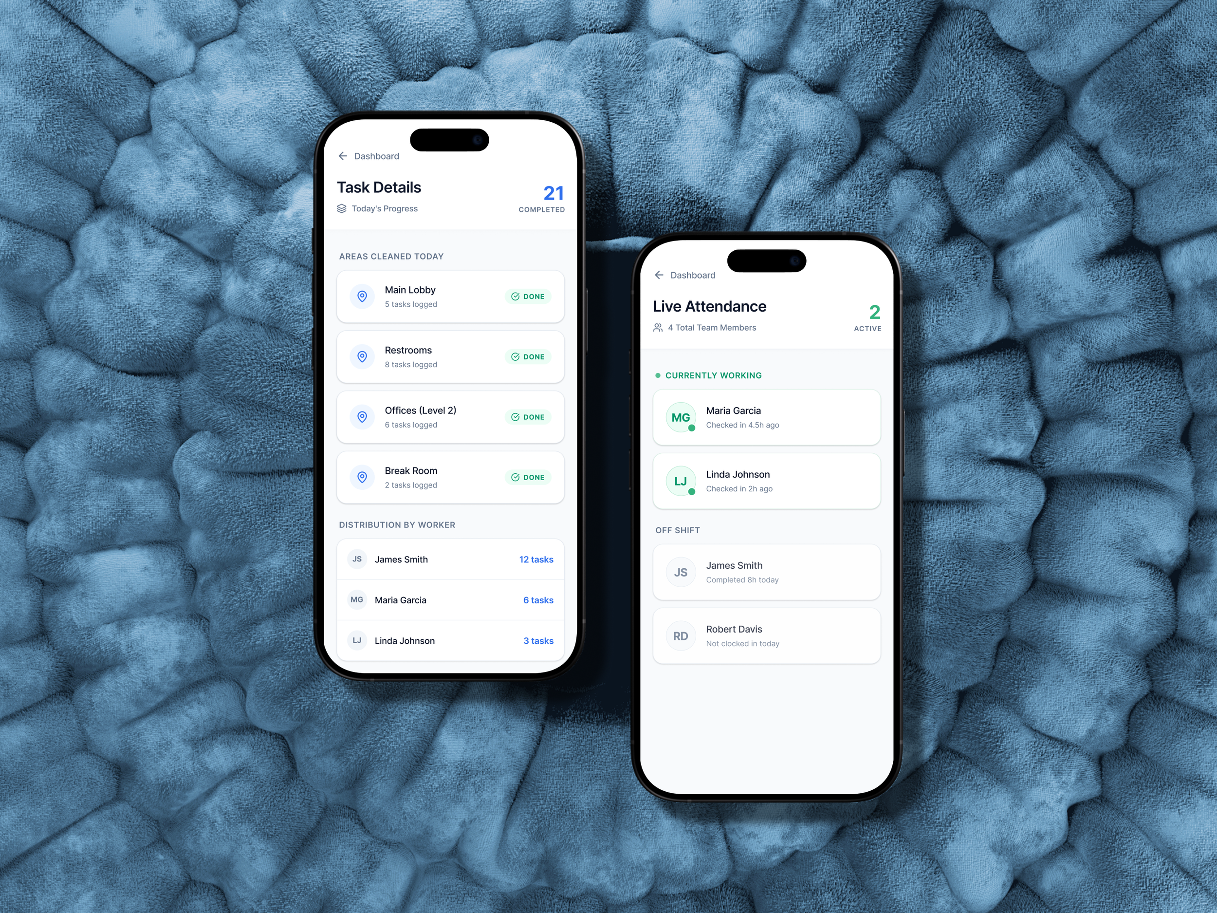 The employer-facing interface provides clear visibility into daily operations while respecting worker privacy. Managers can see who is on shift, how long they have worked, and what tasks have been completed in real time.