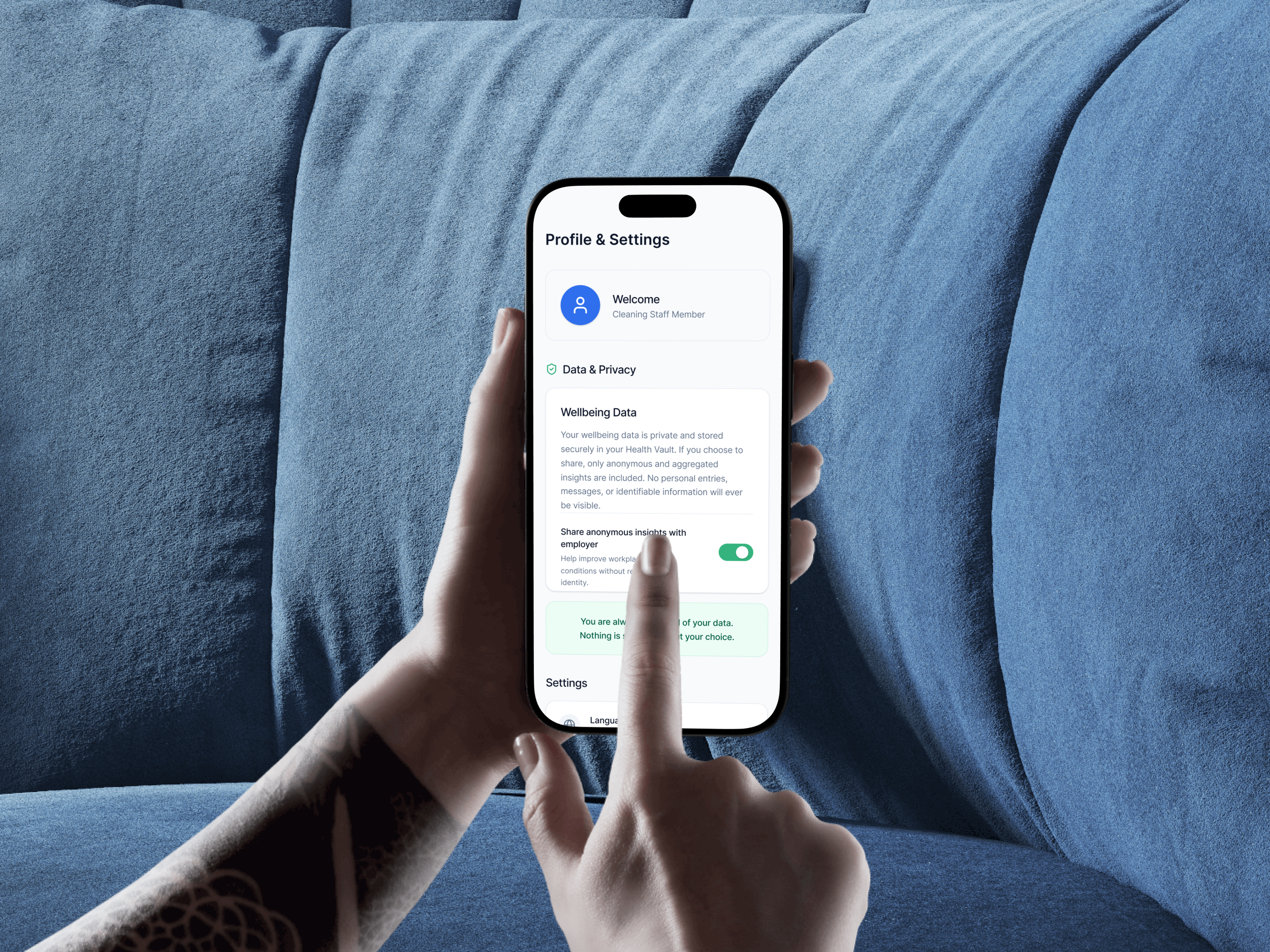 Workers can choose to share their wellbeing data anonymously. Instead of exposing individuals, the system transforms these inputs into team-level insights, enabling support without compromising privacy.