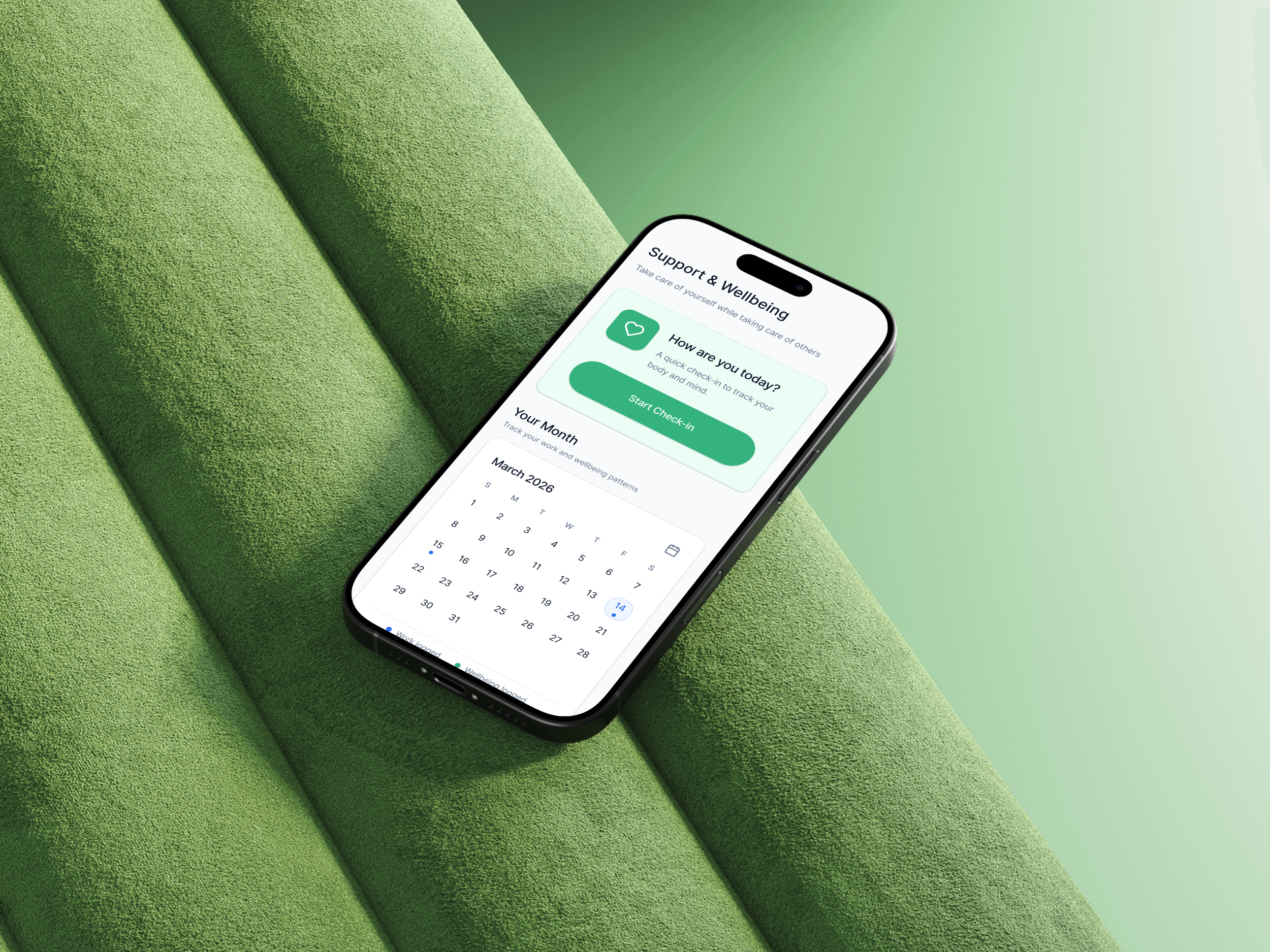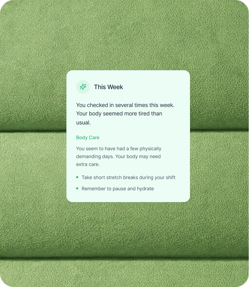 The app also includes a wellbeing system that supports workers beyond their daily tasks. Through short check-ins, users can reflect on their physical condition and emotional state, while a calendar helps them track patterns over time.